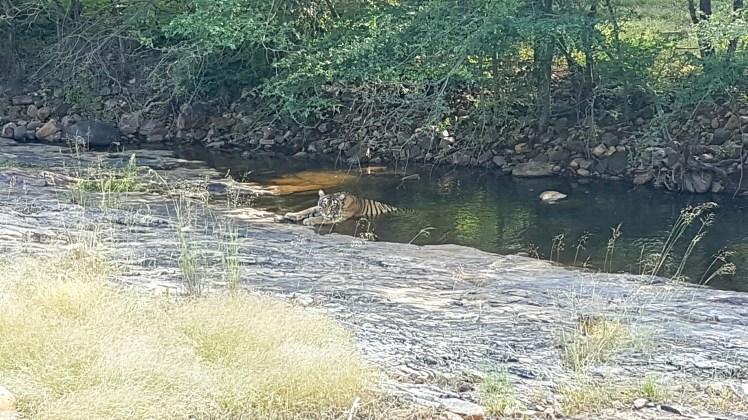On réussi à trouver un bon point de vue et ça y est, on peut observer le tigre qui se glisse dans la petite rivière et prends la pause pendant quinze minutes juste pour nous (‘nous’ les touristes en jeep aha). A ce moment là c’est le bonheur suprême… c’est assez rare de pouvoir en croiser et en plus être si proche. En effet seulement 7 ou 8 mètres nous séparent du félin, c’est incroyable. Une fois ‘paparazzié’ de toute part, le tigre s’en va et nous aussi.