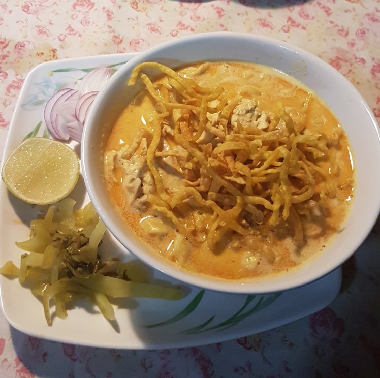 Donc après notre Pad Thaï d’hier soir, nous tentons les Kaoyak. Ce plat typique est une soupe de pâtes au lait de coco & au curry (ça pique sa mère) sur laquelle sont disposées des pâtes frites. C’est divinement bon mais nos langues en feux s’en souviendront !!