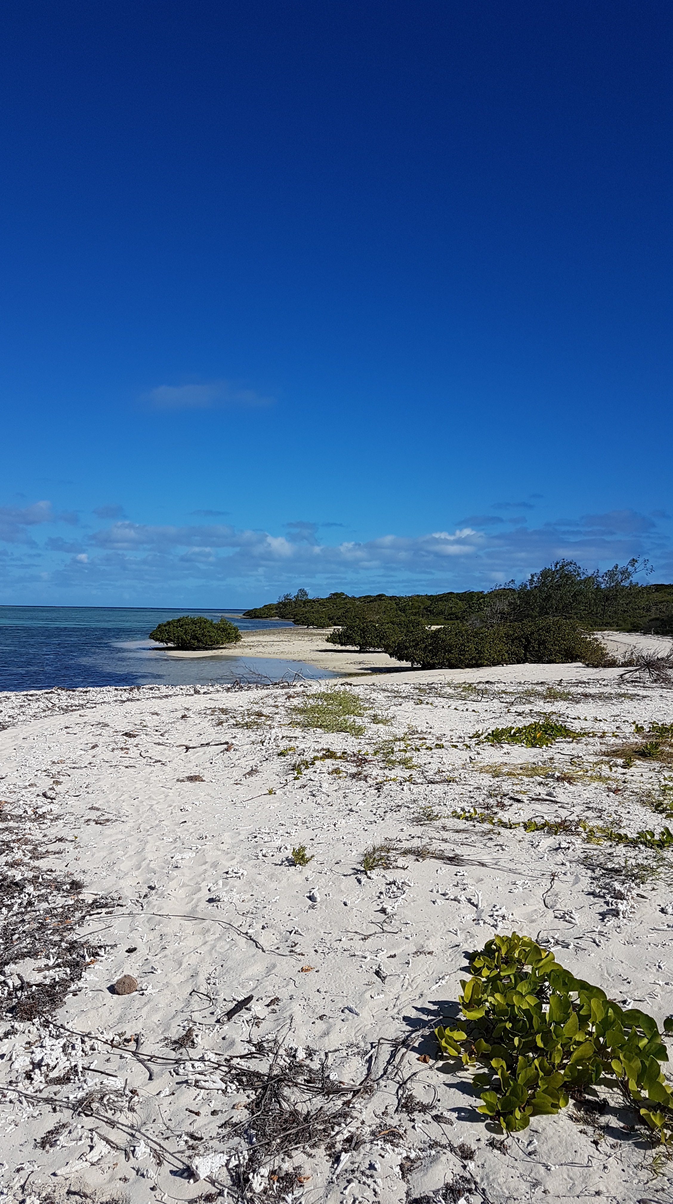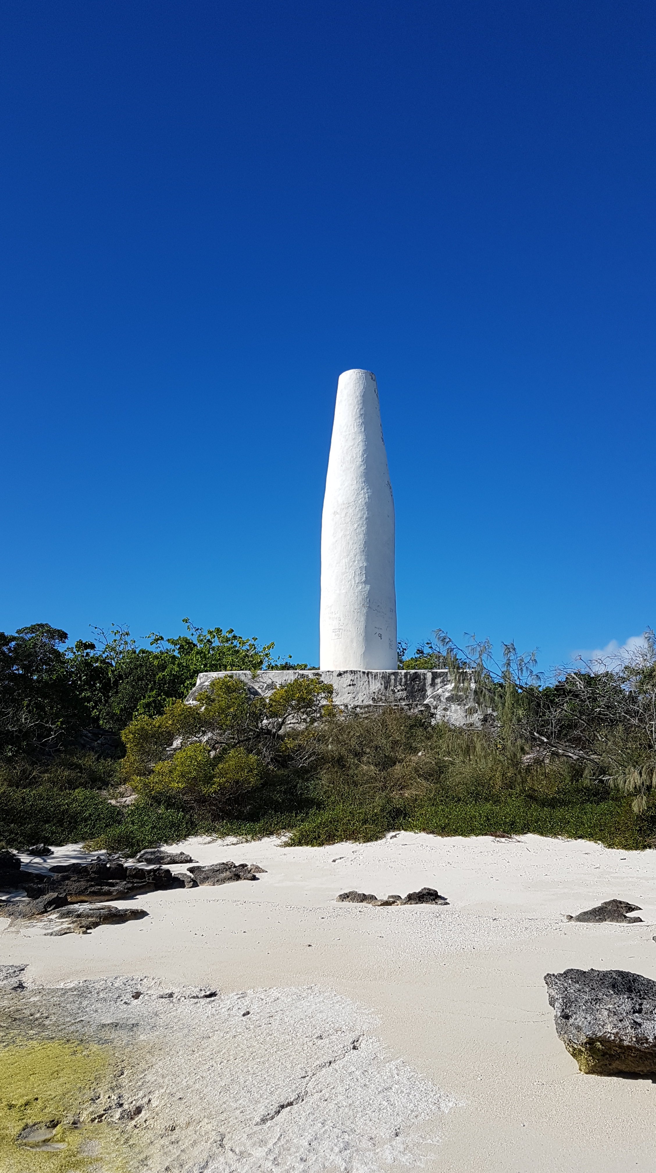 Sur la terre ferme, un sentier permet de découvrir les vestiges du poteau signalétique fait de corail qui a donné son nom à l’îlot. Sur le chemin, nous croisons des tricots rayés, tous en boule dans un trou ! Mais ce ne sont pas les plus à craindre…