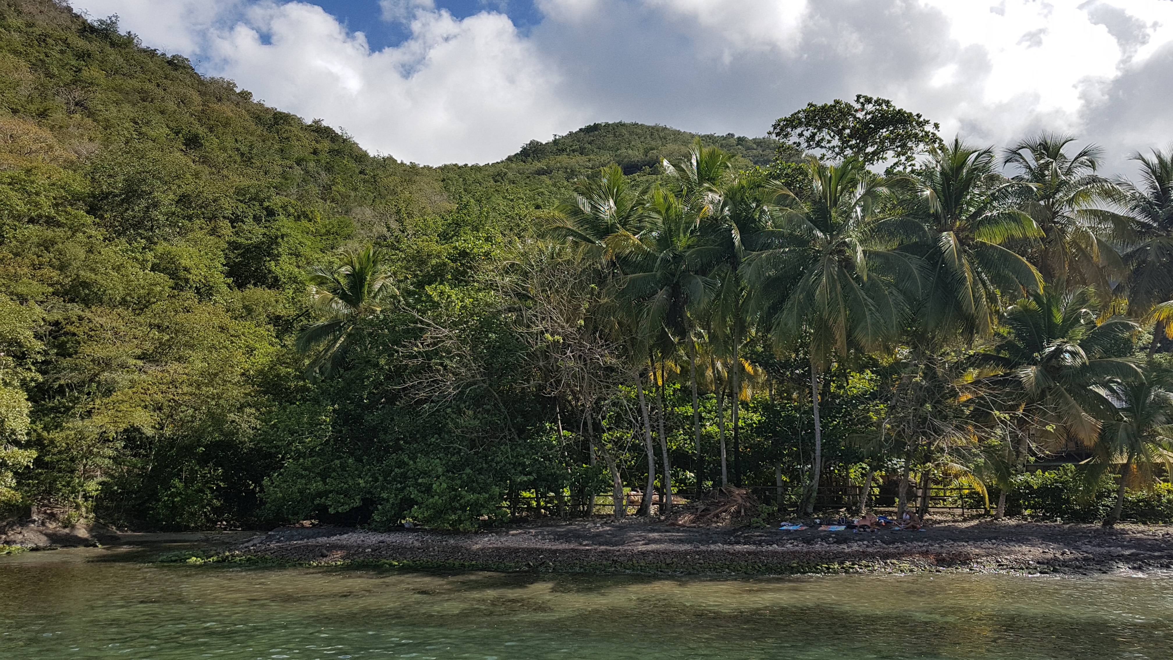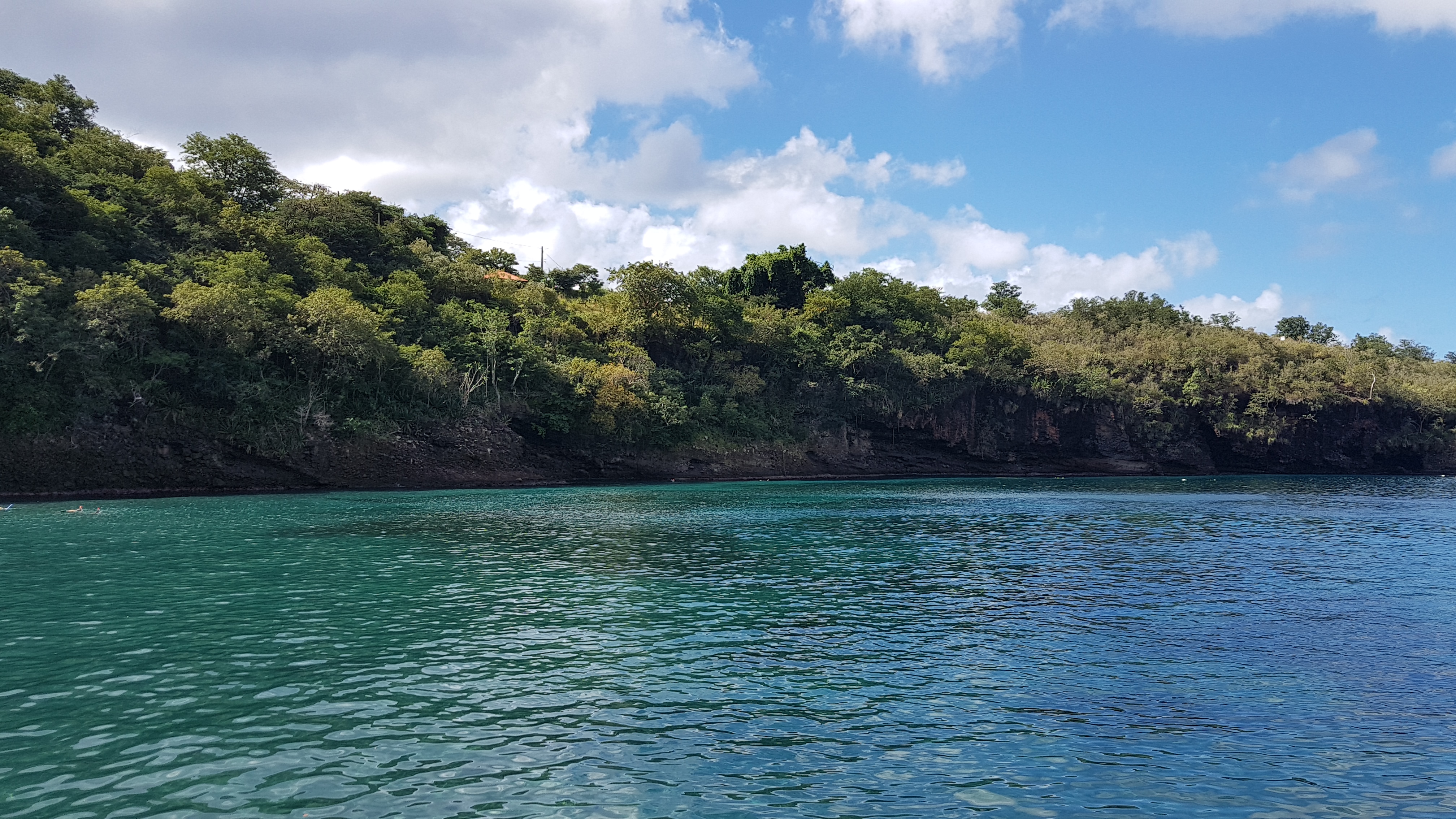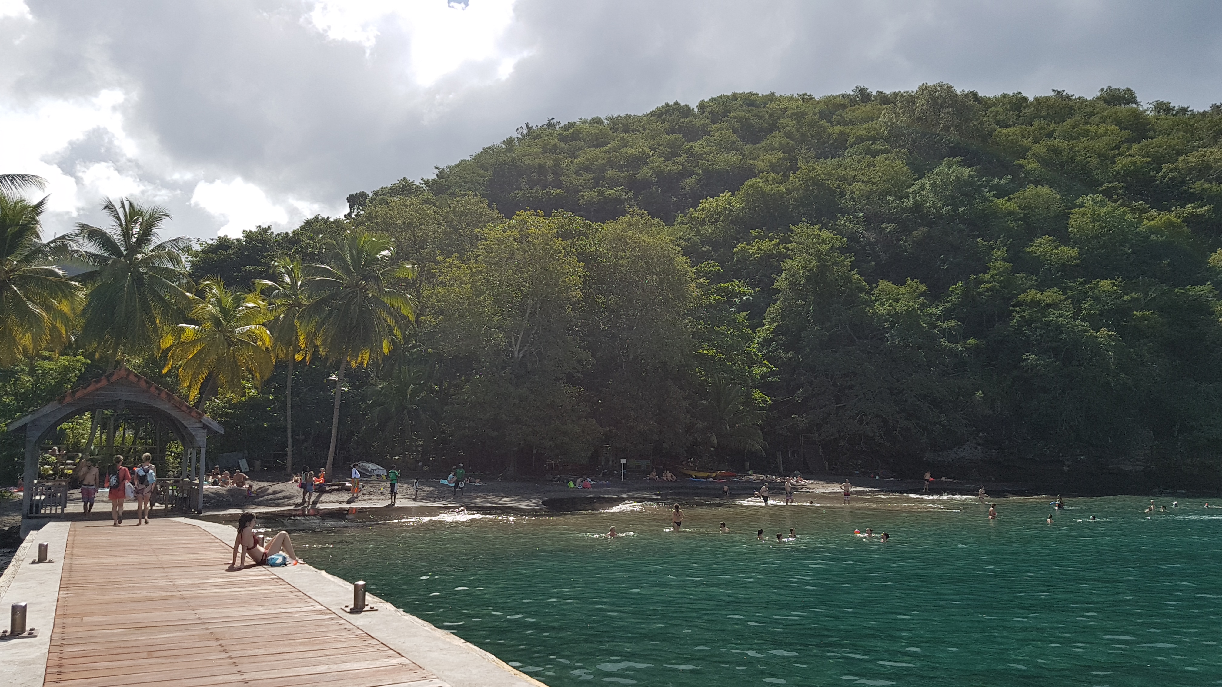 Je vous avoue que j’aime beaucoup cet endroit. L’Anse Noire est dès le premier coup d’œil d’une beauté sans pareil. Le sable noir, les cocotiers, les falaises qui protègent cette crique, l’eau turquoise et cristalline en font un petit bijou de la nature. La plage est petite, il y règne une odeur de soufre désagréable à plusieurs endroits, mais le cadre est idyllique, il y a de l’ombre (fait rare) et il n’y a pas besoin d’être un expert en snorkeling pour admirer des poissons. Avec de la patience, vous pourrez admirer des tortues vertes ou imbriquées, plus ou moins grosses, des bancs de poissons, des coraux et des éponges… Les fonds sont composés de sable ou d’herbiers, donc depuis le ponton, il n’y a aucun risque à sauter ou plonger 😉 Nous concernant nous avons pu observer deux belles tortues dans les herbiers ! Quelle chance… Je suis toujours hyper contente quand je fais une rencontre sous-marine incroyable alors si ça vous arrive, ne souriez pas trop parce qu’avec un tuba, vous allez avaler de l’eau salée et c’est pas vraiment agréable. Bref, nous avons passé beaucoup de temps dans l’eau ce jour là, pour notre plus grand plaisir !