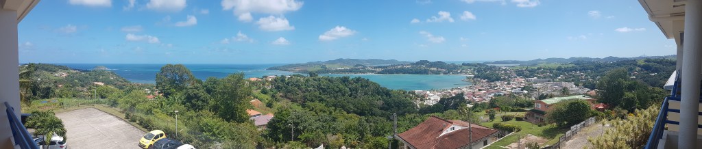 L’appartement se situe au dernier étage d’une résidence sur les hauteurs de Trinité. Il rassemble tous nos critères, même les plus farfelus : il est grand, lumineux, propre, les chambres ont des climatiseurs, il y a une grande terrasse avec une vue sur la mer de folie et même un emplacement pour le hamac 😀 Nous sommes trop contents mais le logement étant vide, il faut rapidement se meubler.