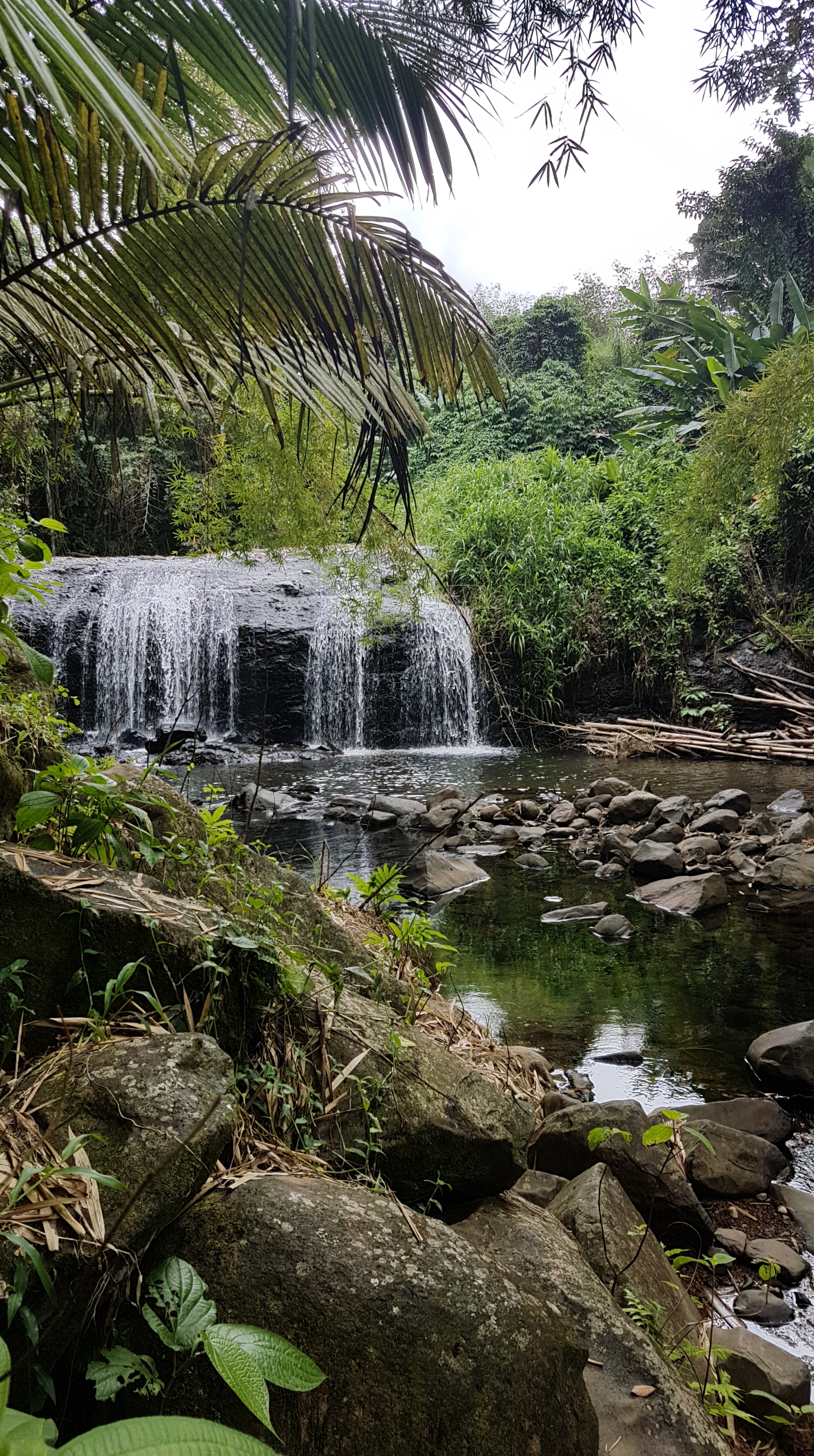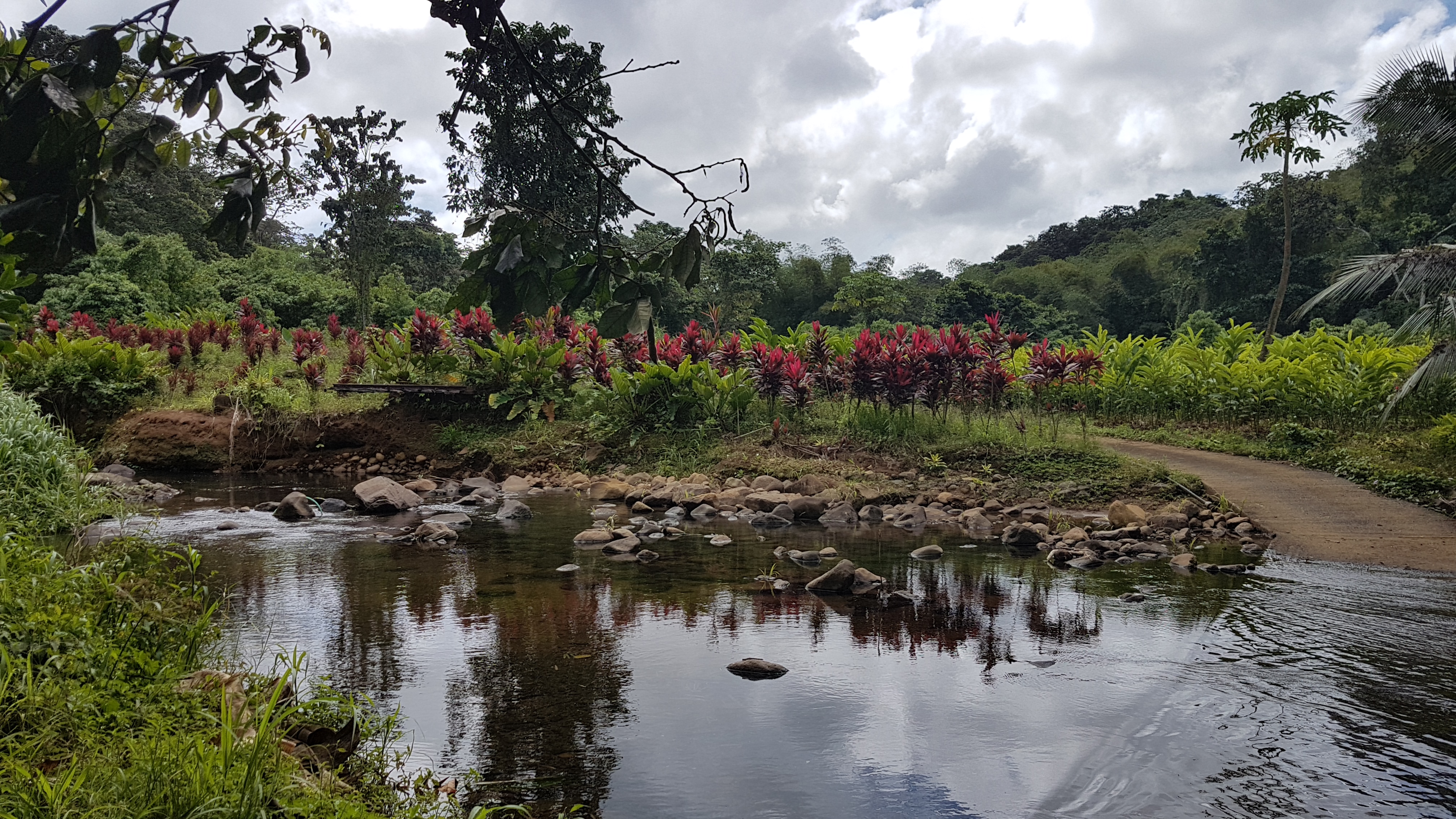 Bô Lariviè Village Loisir se trouve sur un terrain privé. Le propriétaire nous emmène voir la fameuse cascade en nous parlant des différentes plantes médicinales qui se trouvent sur le chemin. La balade est intéressante, on en apprend beaucoup sur les propriétés des feuilles et des plantes environnantes. Sur le trajet, nous goûtons à une petite baie sucrée, qui ressemble à la myrtille. La cascade, connue pour être la plus large de Martinique est vraiment très belle. Il est possible de s’y baigner, ou du moins de se glisser dessous ! Néanmoins, comme le propriétaire attend sur la berge, nous ne sommes pas suffisamment à l’aise pour nous attarder.
