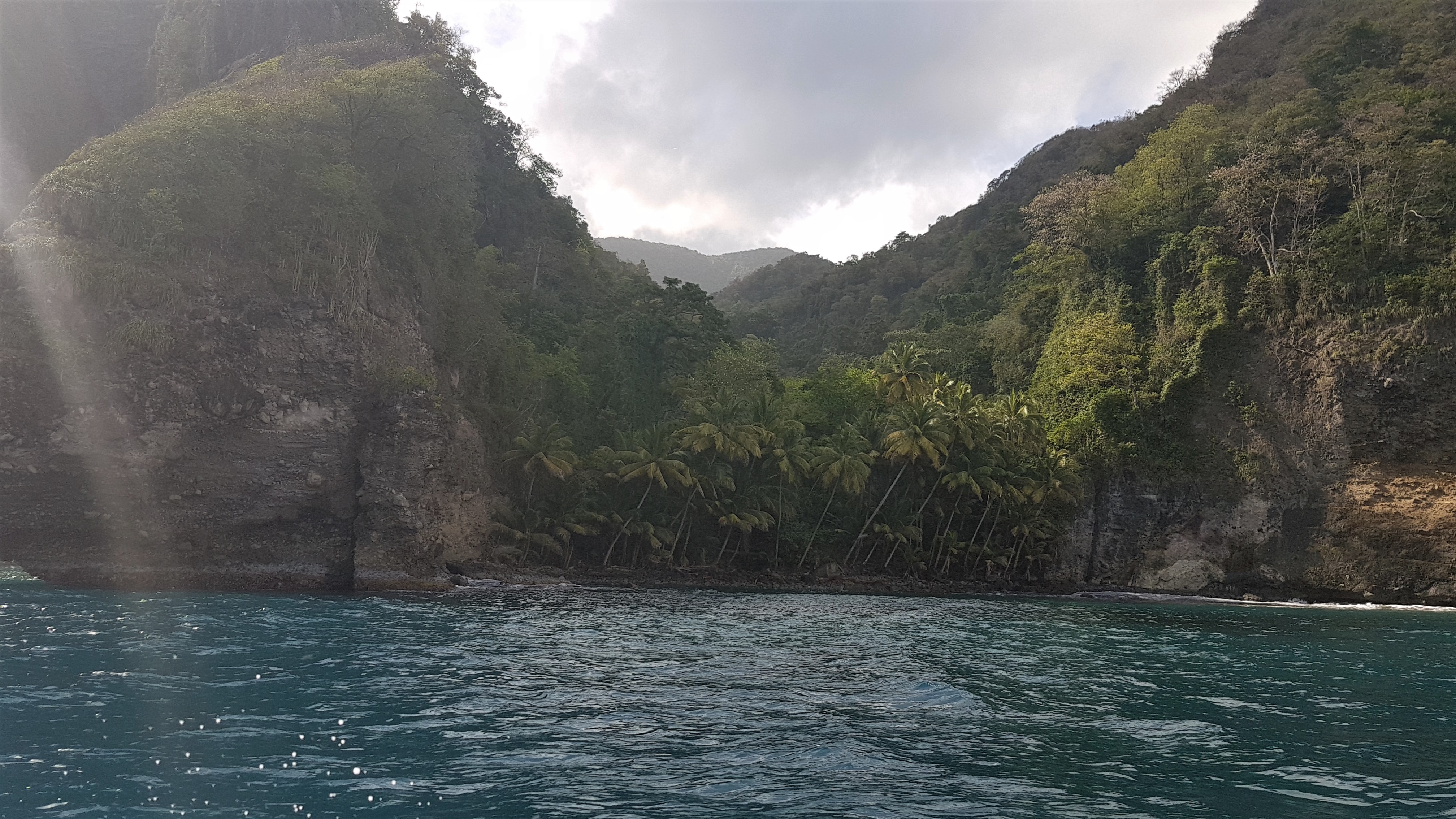 Nous prenons le bateau vers 8h30, direction la plage de l’Anse Couleuvre. Un membre de l’équipage donne quelques petites infos sur les anses devant lesquelles nous naviguons. Le temps de nous rincer les pieds et de nous rechausser, nous démarrons la randonnée à 9h depuis Le Prêcheur.