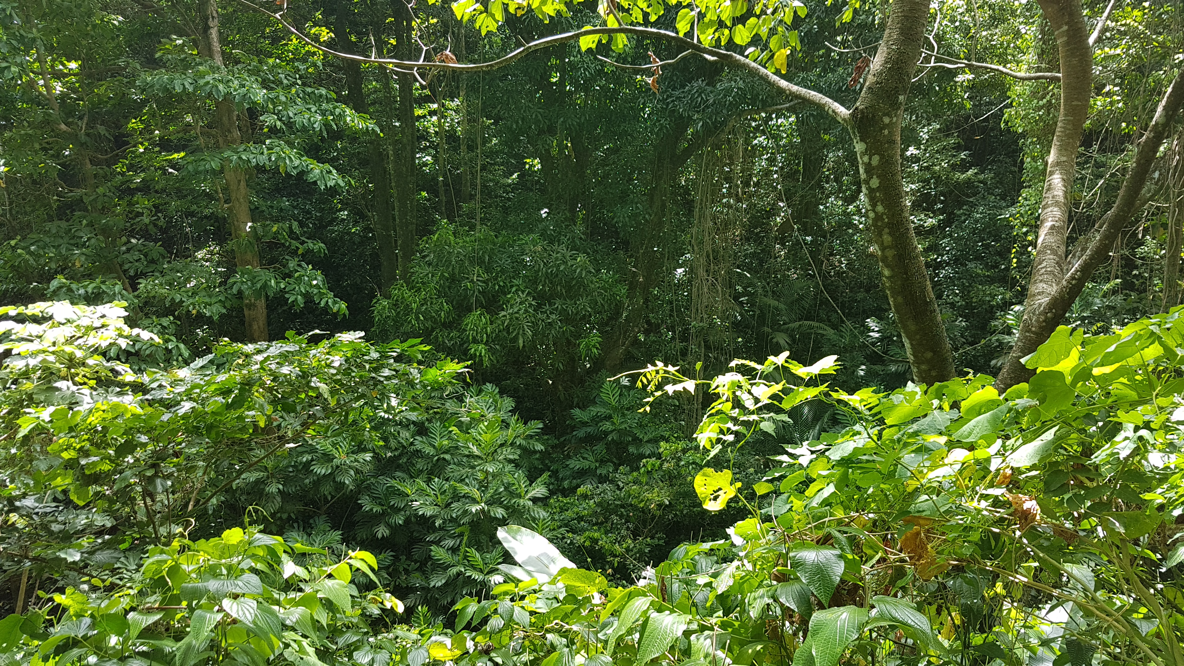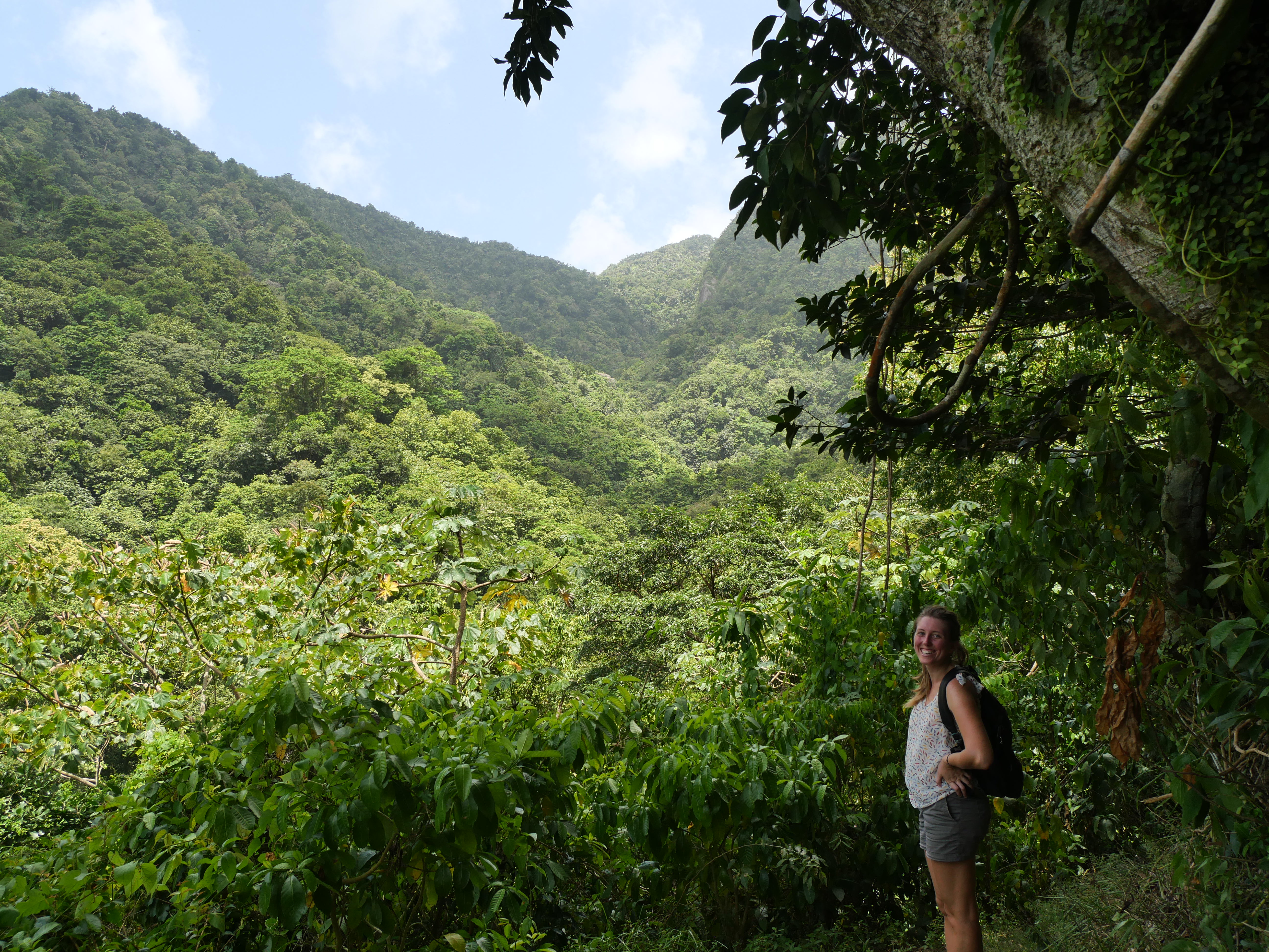 La première partie du sentier est définitivement la plus belle, avec une vue incroyable à chaque montée, des fromagers immenses, des manguiers et d’autres arbres magnifiques. Sur cette portion, nous découvrons un iguane caché dans la végétation. Il s’agit de l’espèce endémique des Caraïbes, menacée d’extinction depuis l’introduction sur l’île de son cousin. Je vous présente Georges, une bel iguane des petites Antilles, doté d’un calme incroyable.
