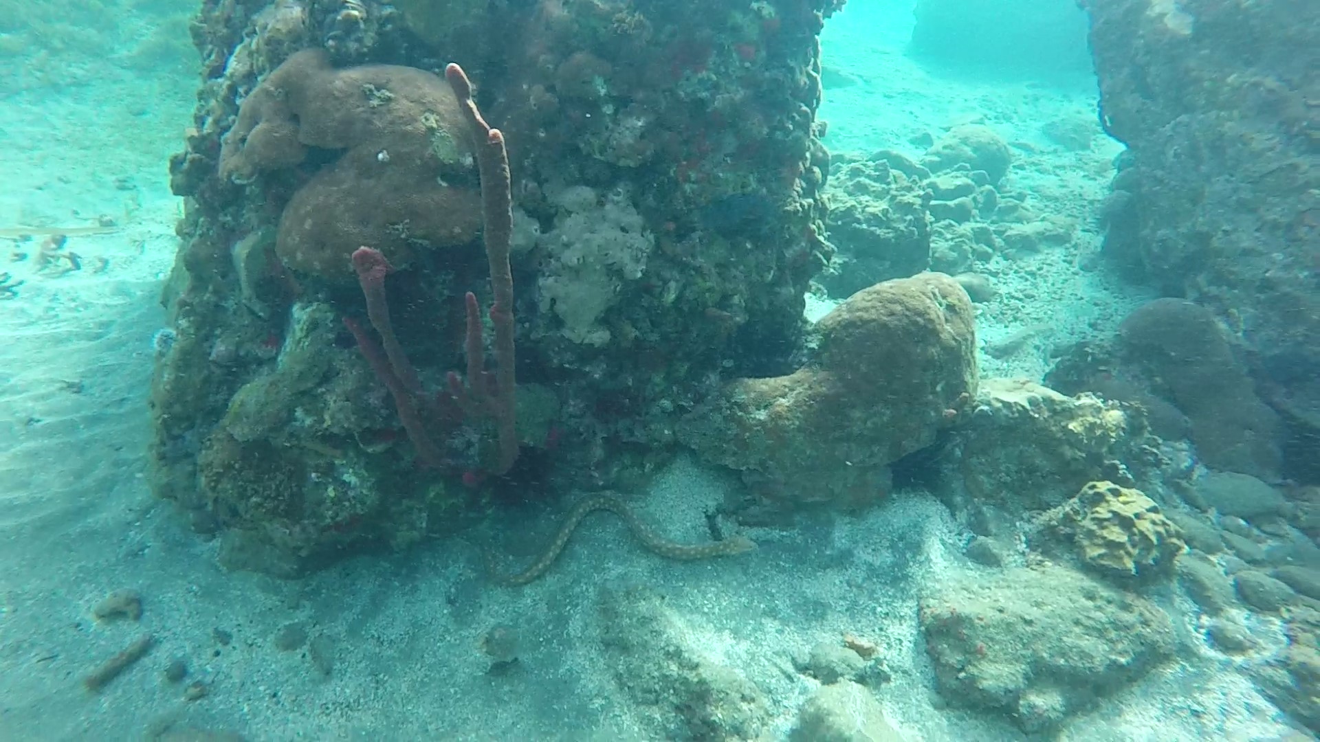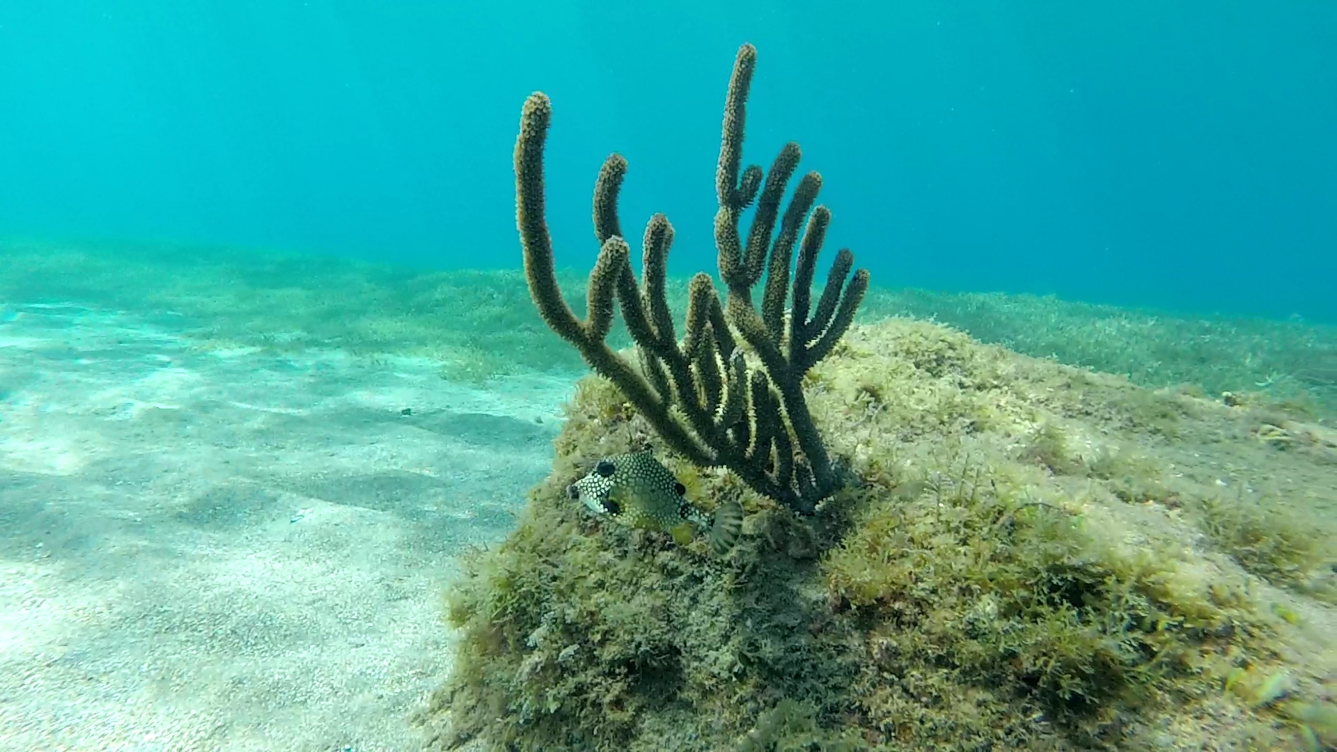 Spot : le spot en lui-même est un peu plus au large, mais il y a pas mal de vie bien avant. On peut déjà admirer des petits poissons, des coraux, des coffres-baguettes, des labres, des anémones… Plus on s’éloigne, plus la vie est riche et plus les rochers sont gros. Alors, on peut voir des murènes, des mérous, des crabes-flèches etc. S’il y a des catamarans et que vous allez jusque-là, sachez qu’il est possible de voir des raies aigles au-dessus du sable ou des herbiers. Les raies sont très peureuses et plus rapides que nous, inutiles de tenter de les suivre, elles nous sèment en deux battements d’ailes 😉