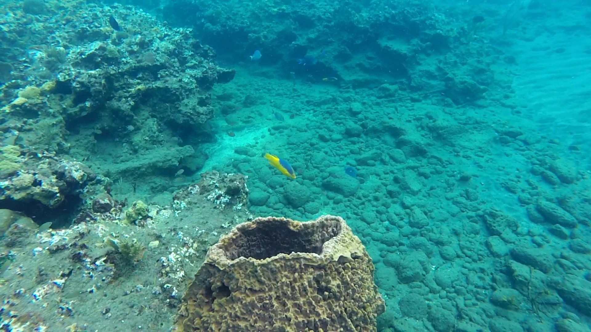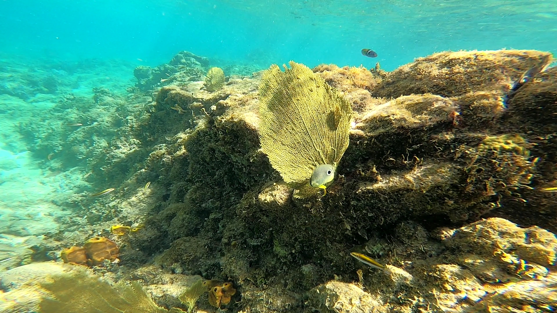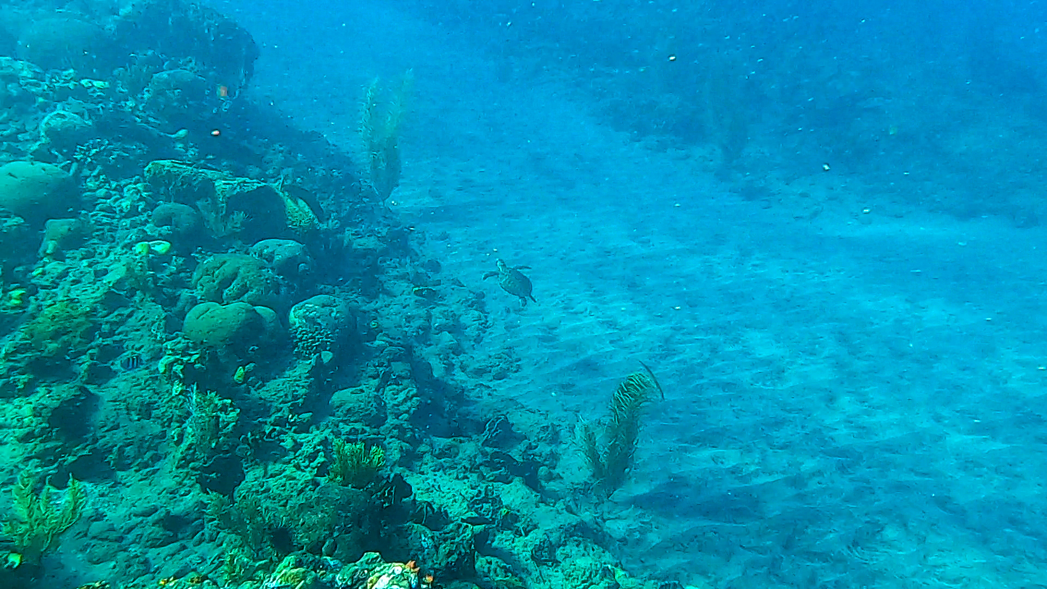 Spot : la visibilité incroyable aide à se repérer facilement, mais le must c’est lorsque l’on plonge enfin la tête sous l’eau pour y découvrir tous ces poissons chirurgiens, absolument magnifiques. La topographie du site est aussi étonnante, il y a pas mal de gorgones et de coraux variés. La faune est riche, avec des poissons perroquets de belle couleur, des carangues, des carrelets, des tortues timides, des crabes flèches et plein d’autres poissons.