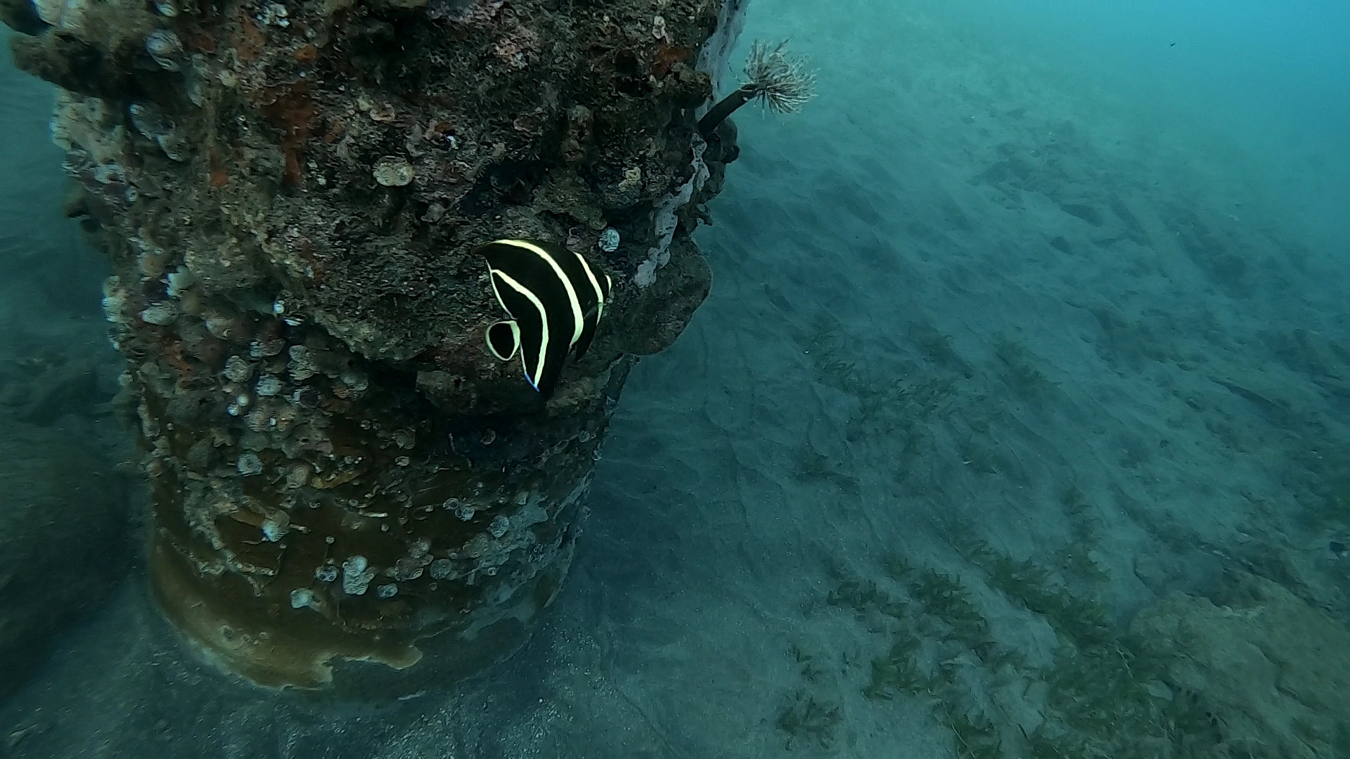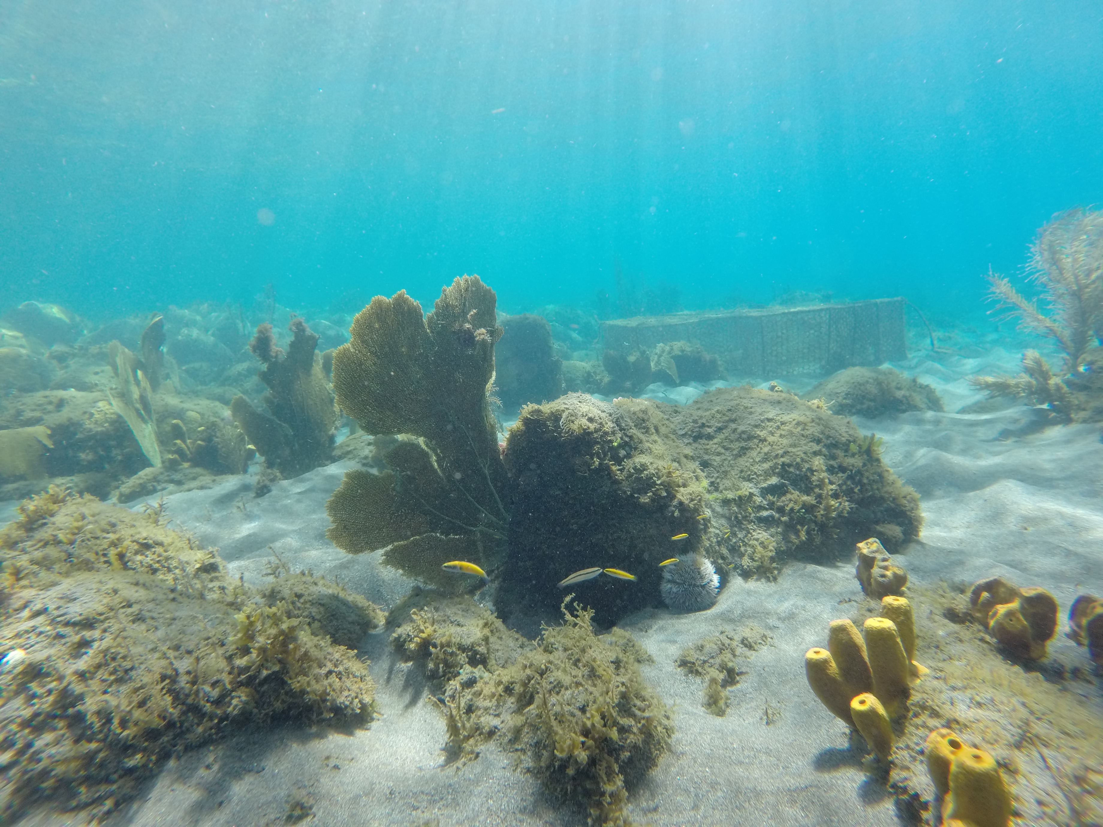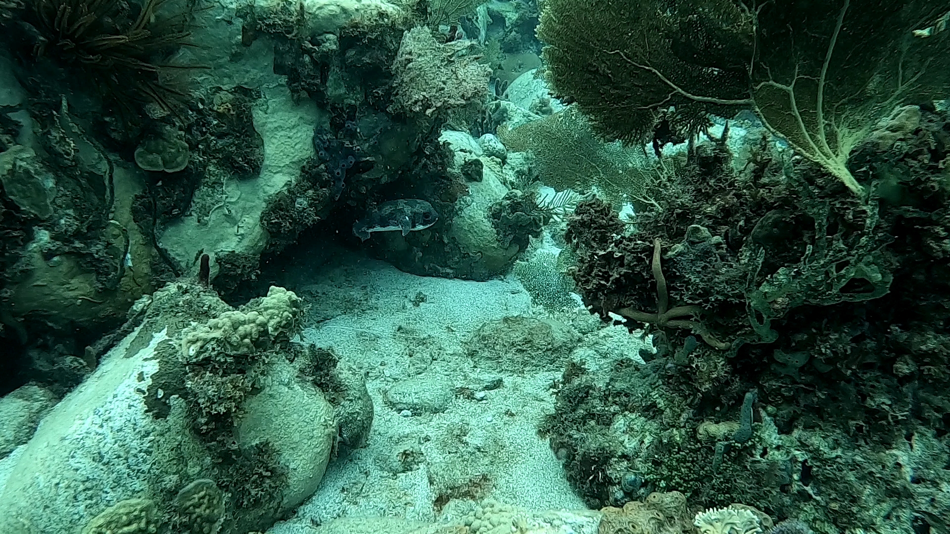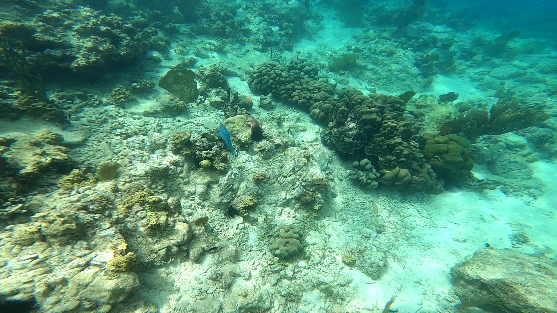 Spot : la visibilité incroyable aide à se repérer facilement, mais le must c’est lorsque l’on plonge enfin la tête sous l’eau pour y découvrir tous ces poissons chirurgiens, absolument magnifiques. La topographie du site est aussi étonnante, il y a pas mal de gorgones et de coraux variés. La faune est riche, avec des poissons perroquets de belle couleur, des carangues, des carrelets, des tortues timides, des crabes flèches et plein d’autres poissons.