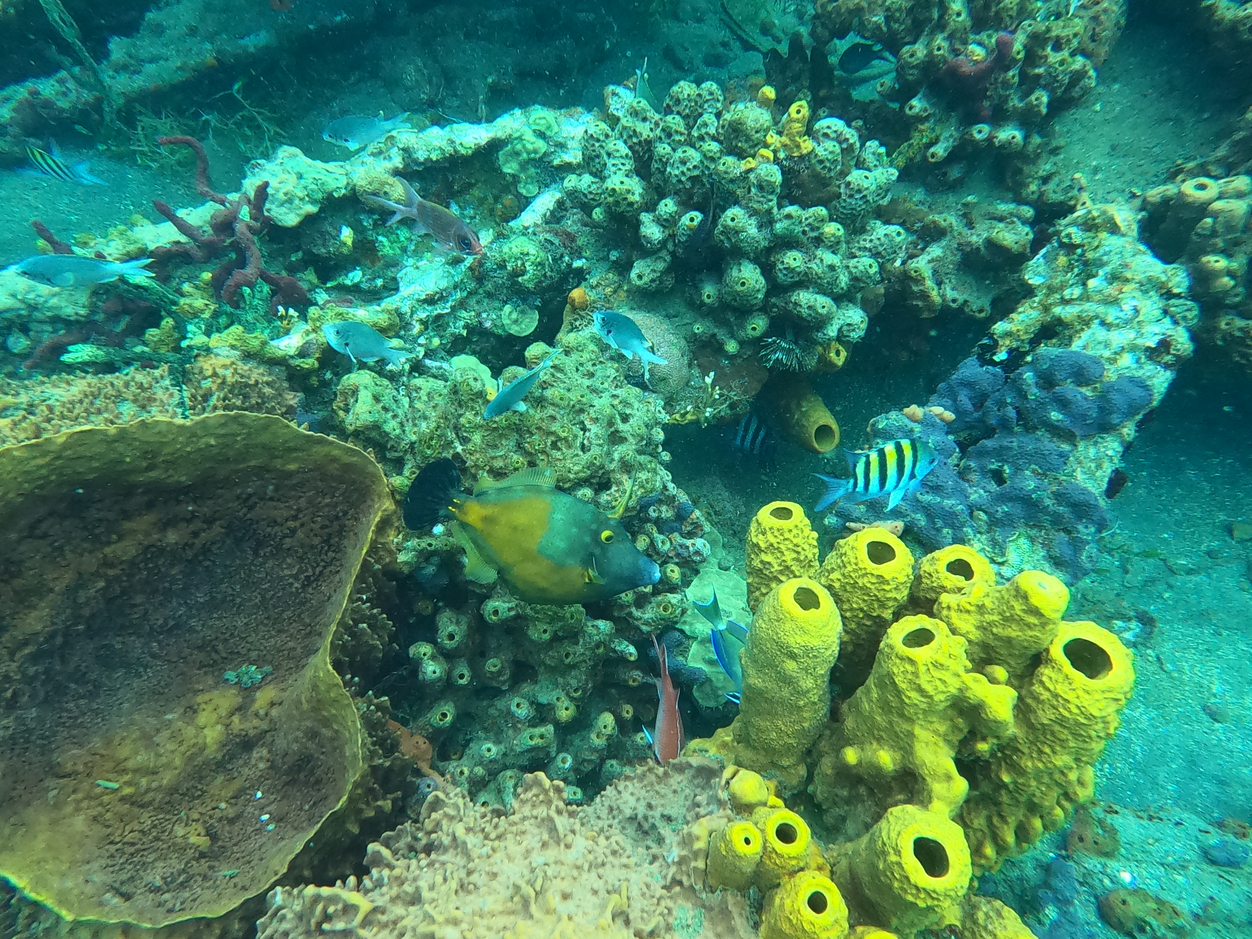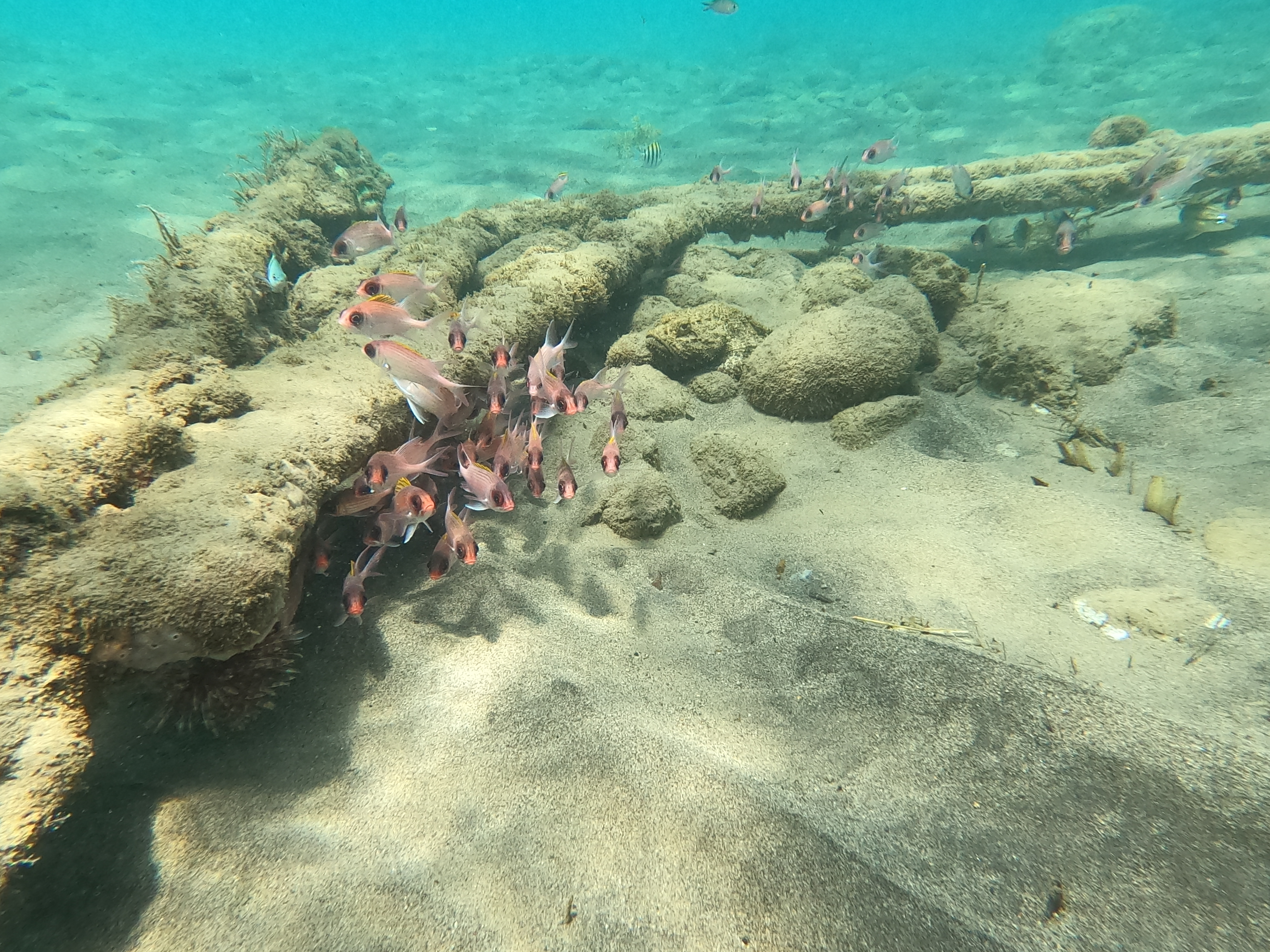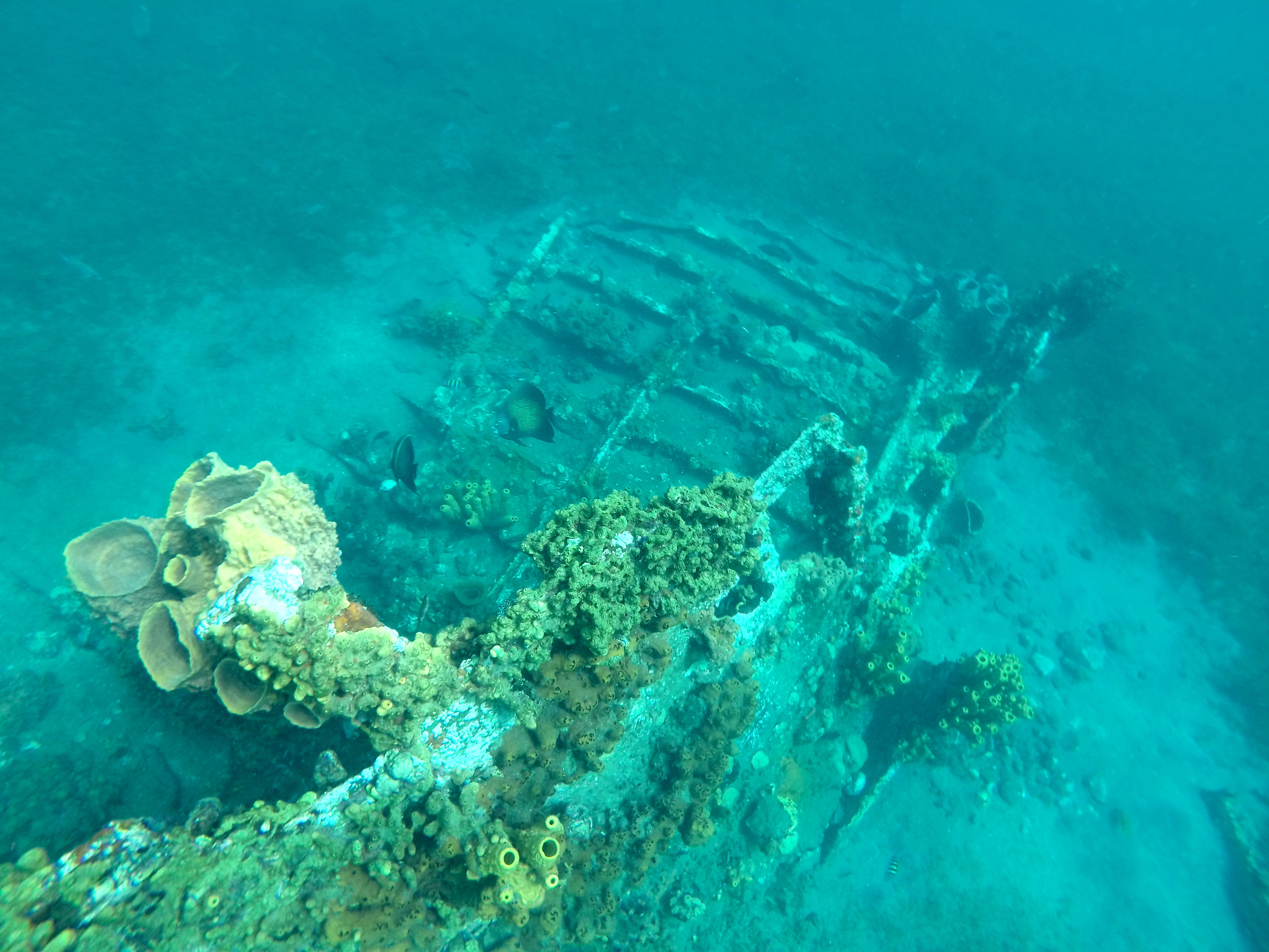 Site : sous vos yeux ébahis vous découvrirez ce qui a dû ressembler à un bateau un jour, désormais recouvert de coraux et d’algues, un écosystème incroyable s’y étant développé. En plus d’y admirer une topographie inhabituelle, on peut admirer des poissons-anges énormes, des rascasses volantes, de gros poissons trompettes, des milliers de petits poissons colorés, bleus, jaunes, roses… et quelques serpentines.