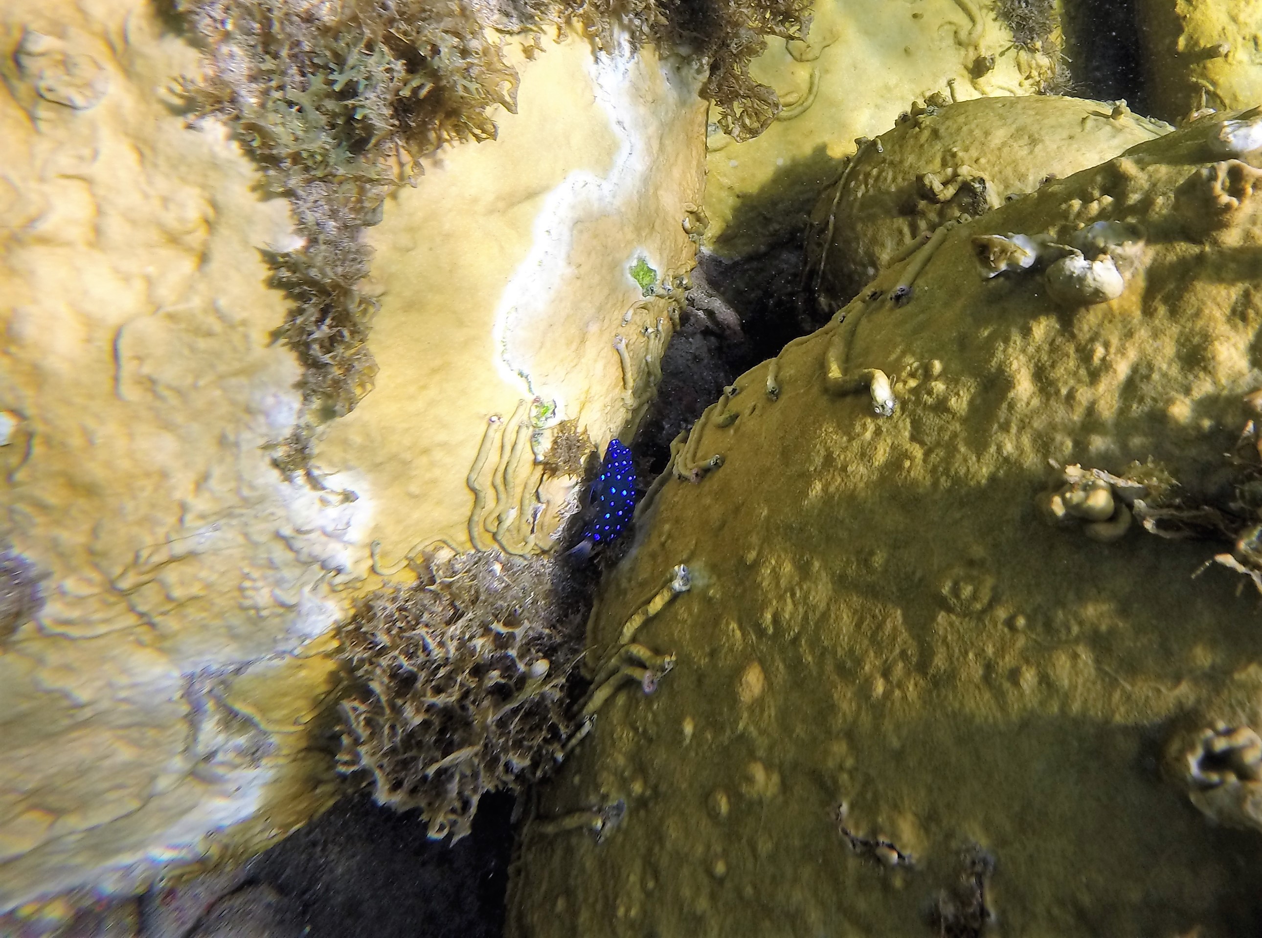 Site : encore une fois, il faut se diriger vers les falaises et les rochers pour admirer la vie qui s’y déroule. C’est un spot magnifique, de la topographie aux poissons colorés, avec des perroquets jaunes et gris, des beaux chirurgiens, des poulpes, des carrelets, des coraux jaunes, des algues immenses et j’en passe.