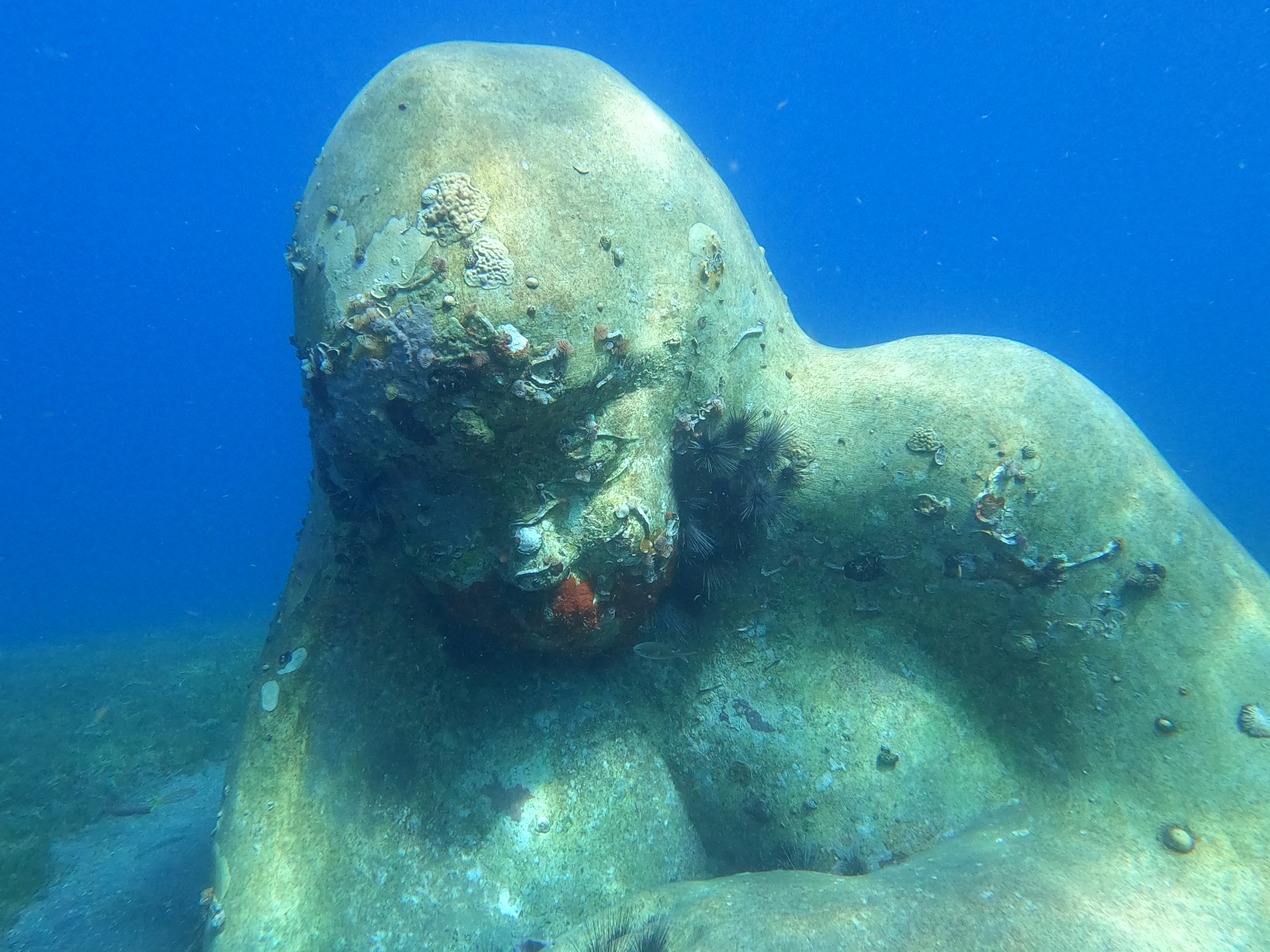 Site : au niveau de cette bouée jaune, nous pouvons contempler la Manman Dlo et la vie qu’elle abrite. Sous nos yeux, un ensemble imposant de cinq sculptures représente deux sirènes. Les coraux tubulaires et éponges ont déjà pris possession des lieux et les bancs de poissons autour sont un régal pour les plongeurs. Vous pourrez aussi observer des diodons, des poissons-lions, des calamars et même sans aller jusqu’à la bouée, des tortues, des murènes, des rascasses… Si d’aventure vous partiez un peu au large, vous vous retrouverez vite avec 25 mètres de fonds. Une sensation d’infini enivrante !